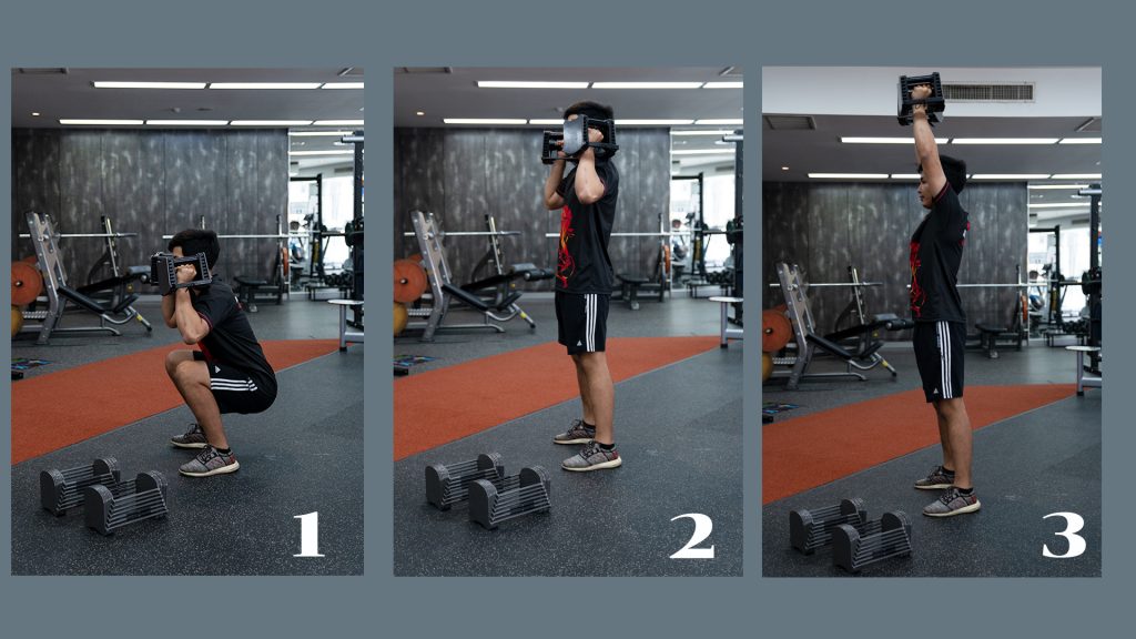 - ยกดัมเบลแบบสแนทช์ – บริหารกล้ามเนื้อไหล่ ขา ลำตัว และหลัง เหมาะสำหรับการพัฒนาพละกำลัง ความคล่องตัว และการประสานงานของร่างกายโดยรวม