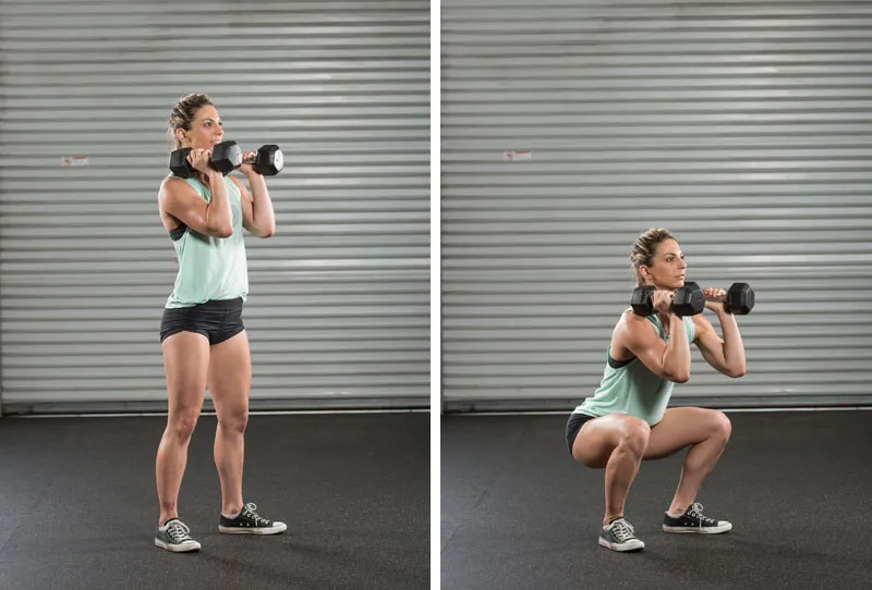 - ดัมเบลสควอท –เน้นกล้ามเนื้อต้นขาด้านหน้า ต้นขาด้านหลัง และสะโพก เป็นท่าออกกำลังกายพื้นฐานที่ช่วยเสริมสร้างความแข็งแรงของขาโดยรวม