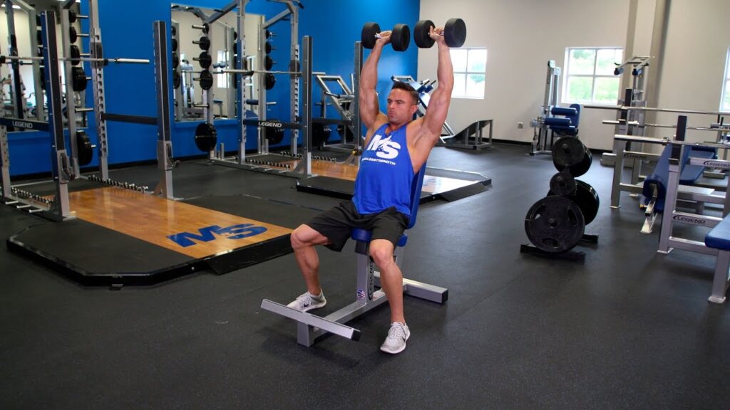 - ดัมเบลเพรสไหล่ – บริหารกล้ามเนื้อทั้งสามส่วน โดยเน้นที่กล้ามเนื้อเดลตอยด์ด้านหน้าเป็นหลัก