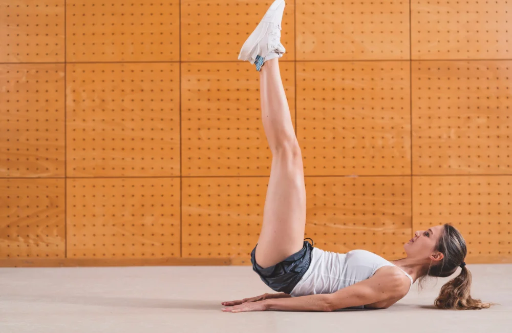 - เกร็งหน้าท้องแล้วยกขาทั้งสองขึ้นให้ตั้งฉากกับพื้น