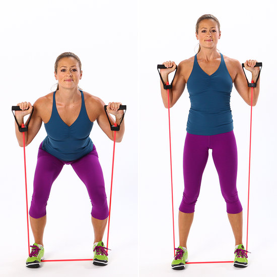 ก้าวขาขวาไปข้างหน้า วางยางยืดไว้ใต้เท้าขวาและจับปลายยางยืดทั้งสองข้างไว้ จากนั้นงอเข่าย่อตัวลงไปเหมือนท่าบริหารขา (Lunge) พร้อมกับยกแขนขึ้นให้สูงเลยศีรษะ ค่อย ๆ ลดแขนลงกลับมาอยู่ในท่าเริ่มต้นและทำซ้ำข้างละ 12-24 ครั้ง