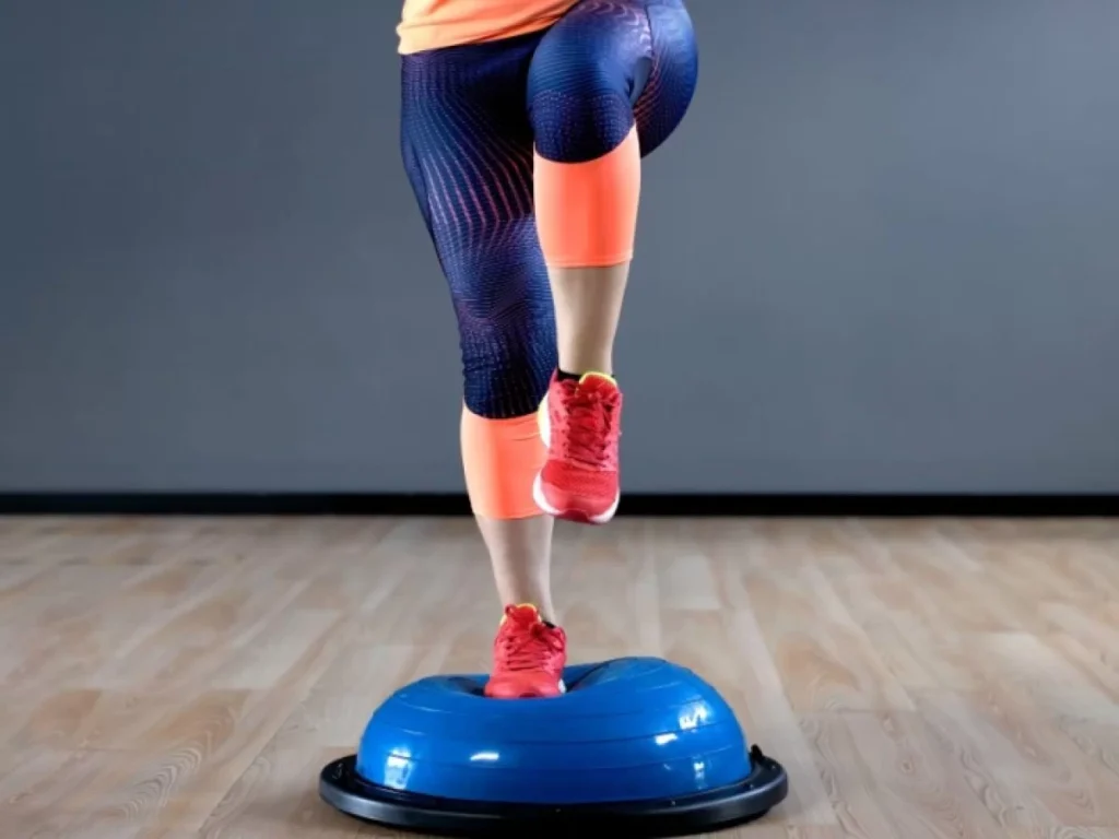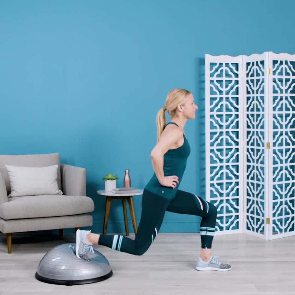 - ท่าลันจ์: ก้าวเท้าข้างหนึ่งขึ้นไปบนโดม แล้วทำท่าลันจ์ โดยเกร็งกล้ามเนื้อแกนกลางลำตัวและกล้ามเนื้อขา