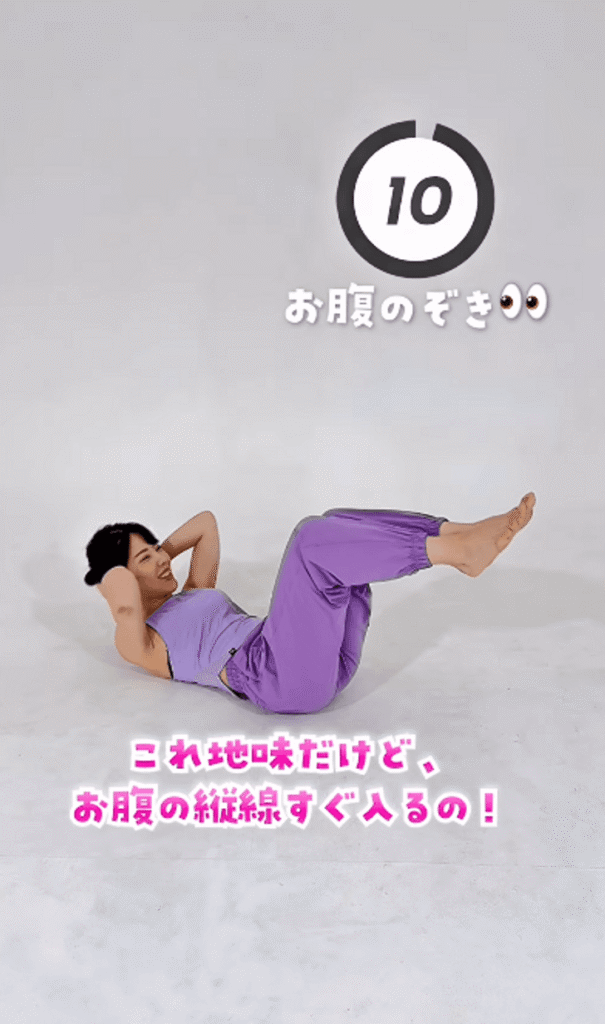 - นอนราบ งอเข่า มือประสานท้ายทอย ค่อย ๆ ยกลำตัวขึ้น พร้อมยกขาให้เข่าตั้งฉากกับพื้น คล้ายจะใช้ศอกแตะเข่า แล้วเกร็งหน้าท้องค้างไว้ 10 วินาที