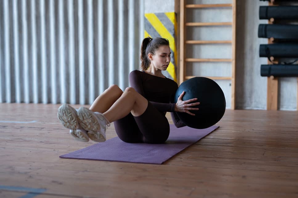 • วิธีท่า Russian Twist : นั่งลงบนพื้น งอเข่าและยกขาขึ้นเล็กน้อย เอนตัวไปด้านหลังเล็กน้อย ใช้มือทั้งสองข้างถือวัตถุหนักหรือใช้มือเปล่า บิดตัวไปด้านข้างซ้ายและขวา สลับกัน ทำ 20 ครั้ง